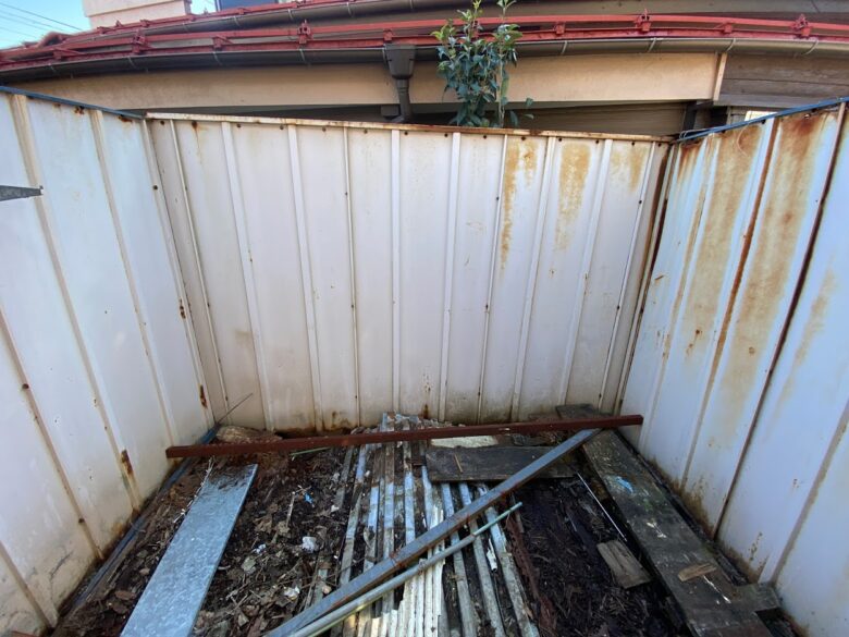 物置は現在使用されておらず、屋根などが抜け落ちている状態でした。